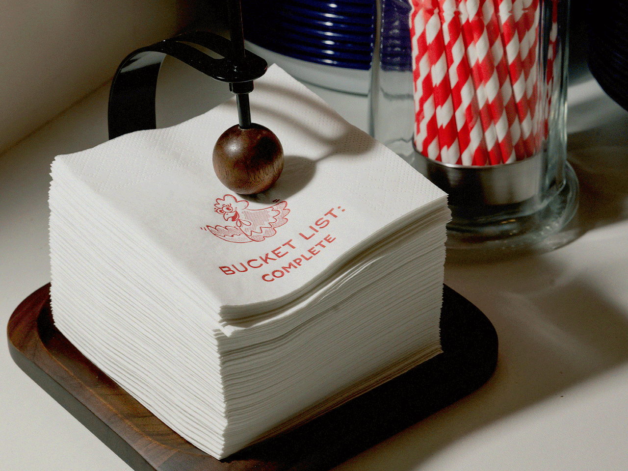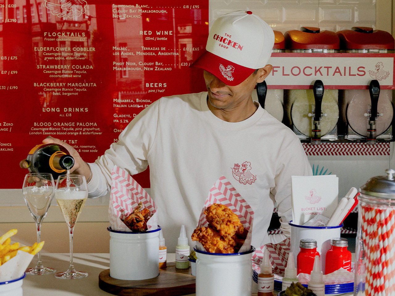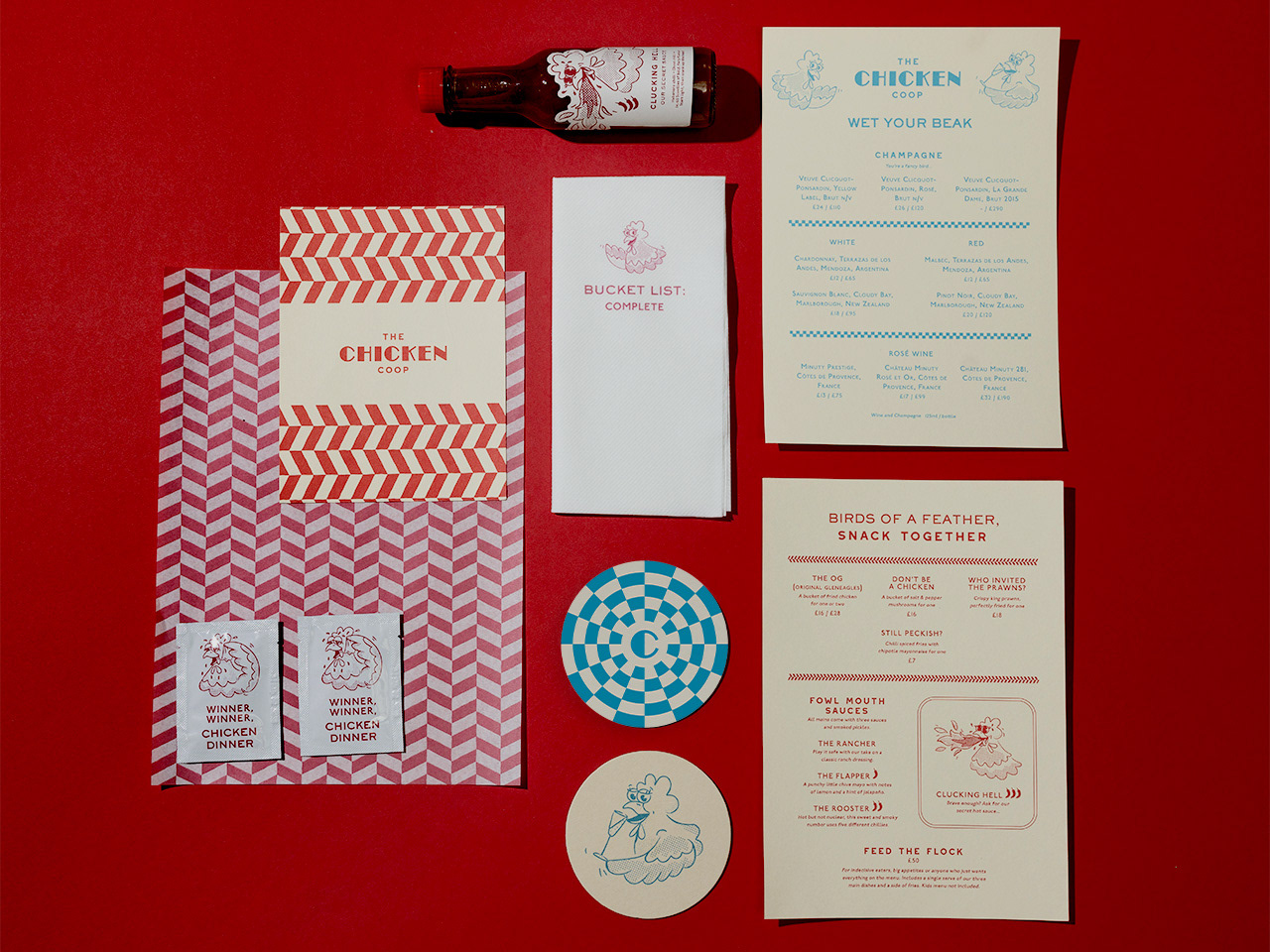 A match made in heaven: fried chicken & champagne. This picture shows menu signage, uniforms, napkins and greaseproof paper designed for the pop-up. Photography: Suzie Lowe. Art Direction: Rosie Conroy.