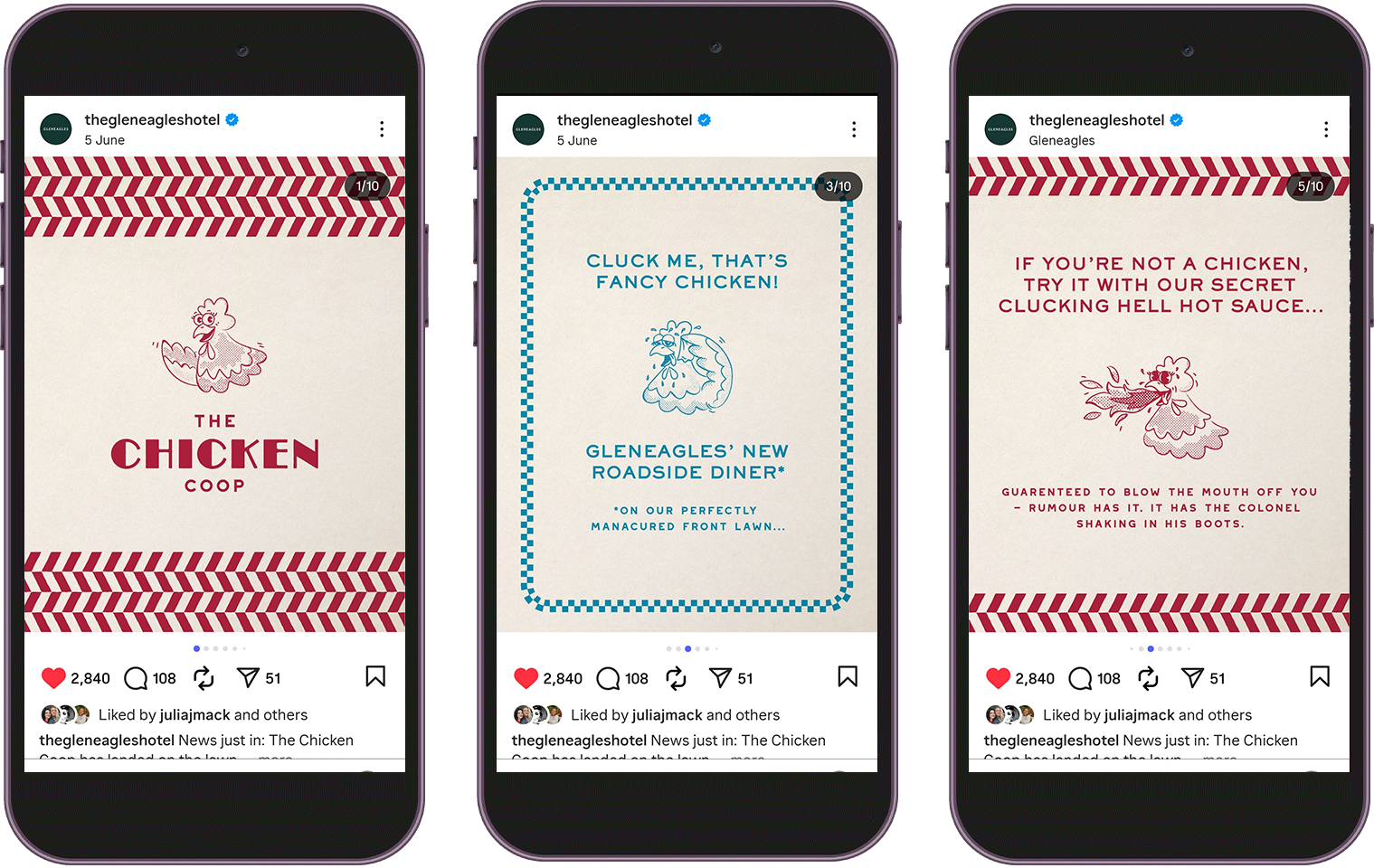 Gleneagles' annual summer lawn pop-up took a new twist in 2025: a fried chicken and champagne bar, uniting the hotel's luxury with a relaxed foodie favourite. I developed a visual identity inspired by the retro feel of American diners, marrying a personality-led approach with an elevated look-and-feel. The pop-up was hugely popular with guests, team members, and brand sponsors, sparking dedicated spin-off events including a Festive edition.