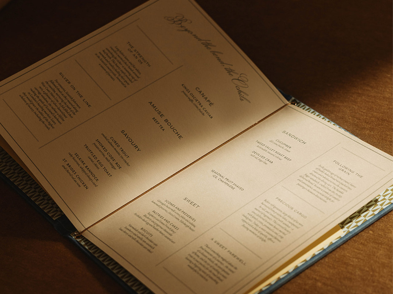 Turning the page, guests metaphorically enter the train. A pattern inspired by moquette (the lively designs of upholstered train seats) and Art Deco book covers adorns the menu's end papers. The pattern also echoes the geometric prints found in the interior design of the Glendevon room.